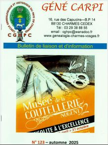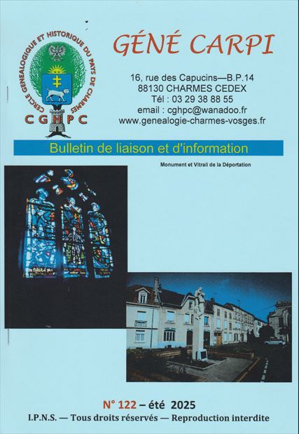 Le génécarpi est un quadrimestriel édité par le Centre Généalogique et Historique du Pays de Charmes. Il relate des faits historiques, géographiques locaux, présente les travaux généalogique de familles, retrace les grands moments de l'Histoire. Le génécarpi est disponible au centre ou sur commande.